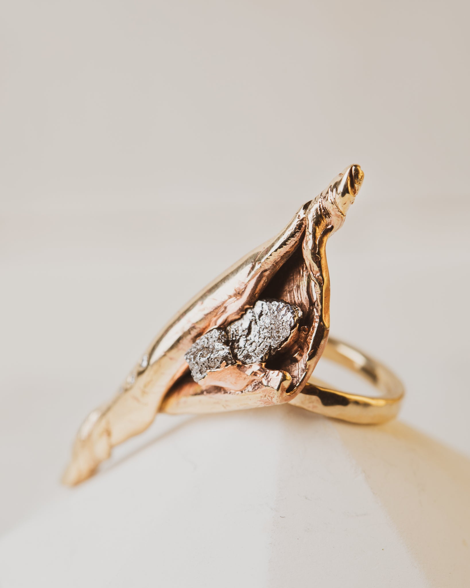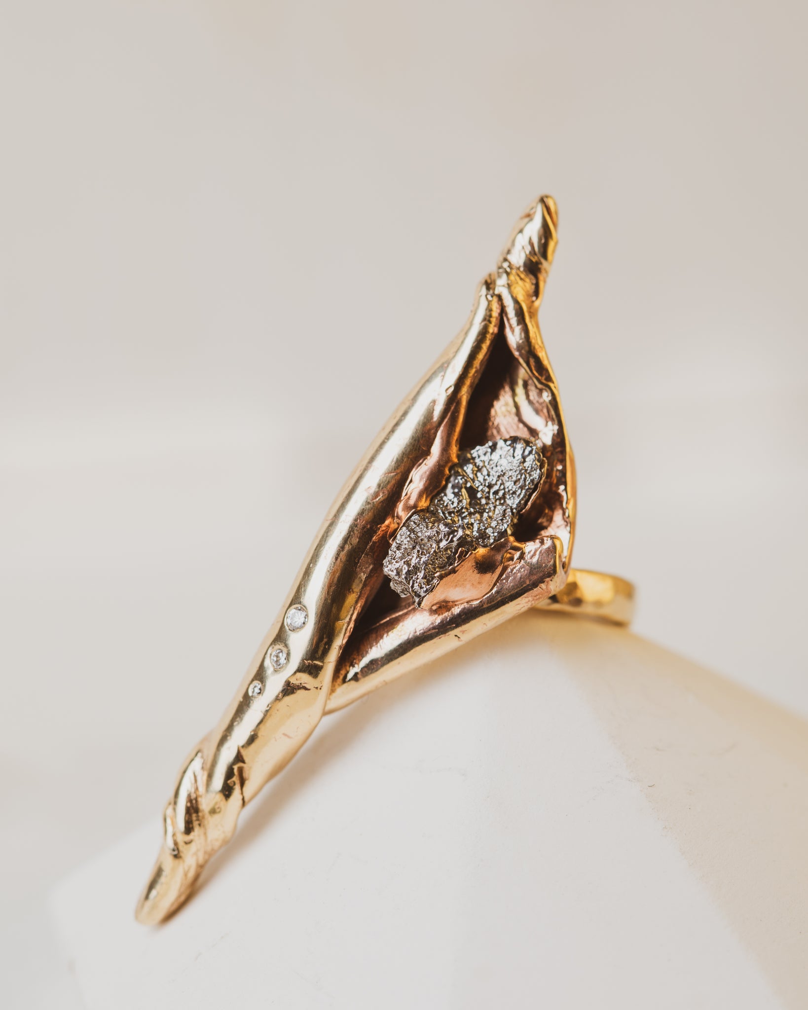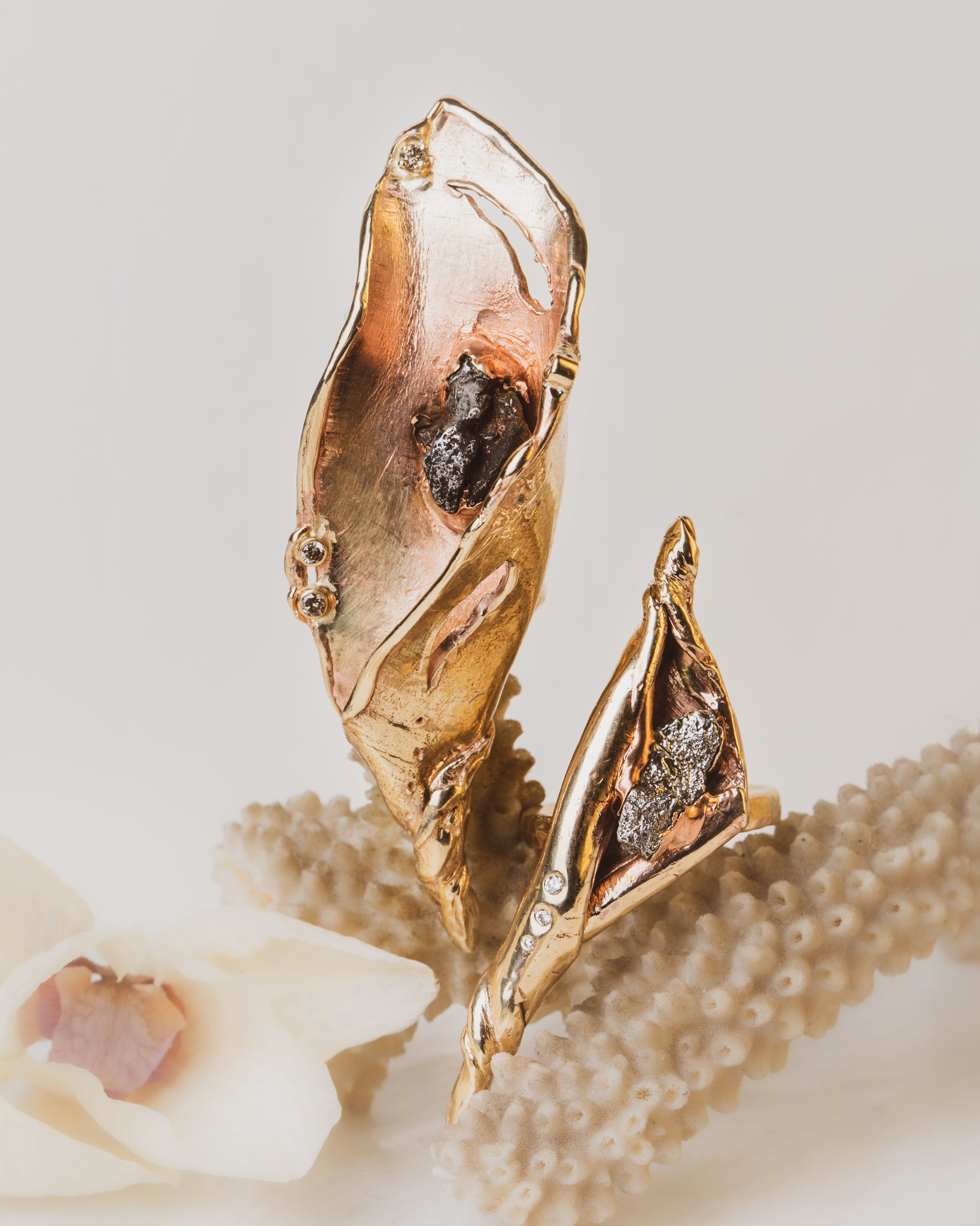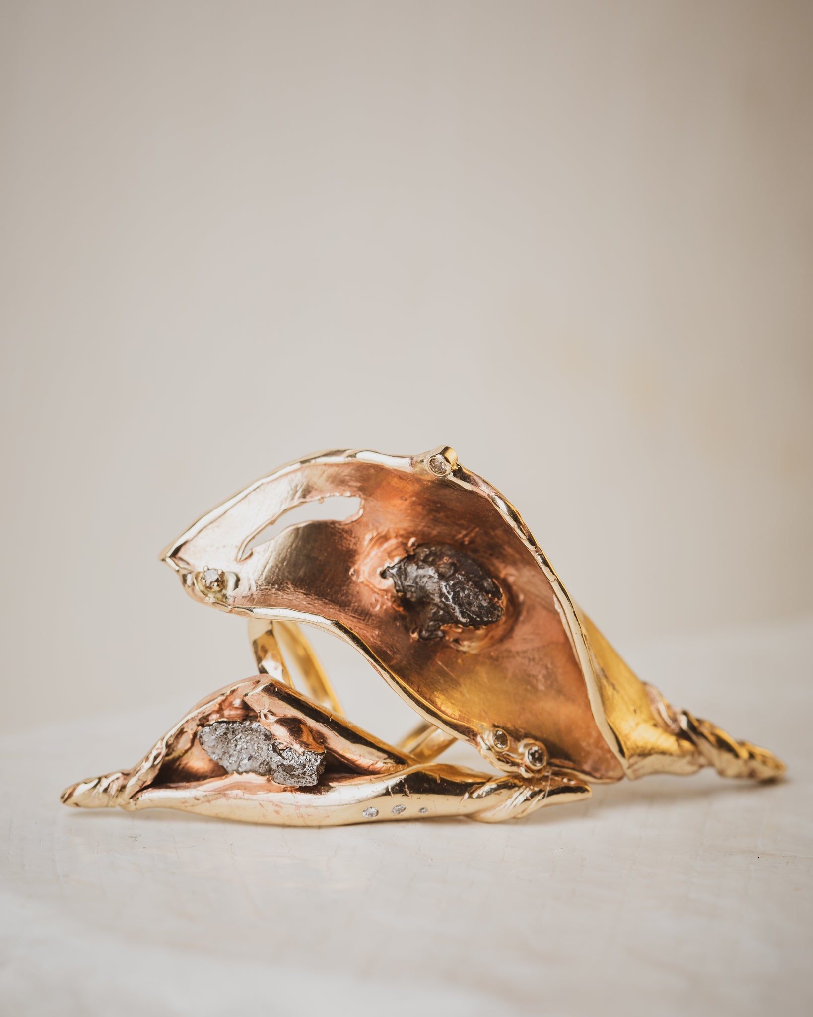 A single meteorite, wrapped in 14K gold ring to wear as a ring or scarf slide. 3 small diamonds, like shooting stars alight the tail of the form.